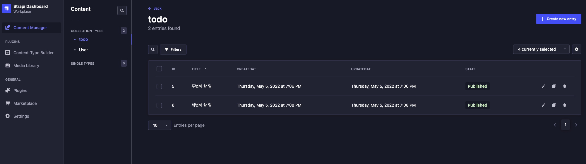 Strapi 안에서도 데이터가 잘 등록되어 있군요. 자 우리는 기본적인 API를 사용해서 Todolist를 만들었습니다.