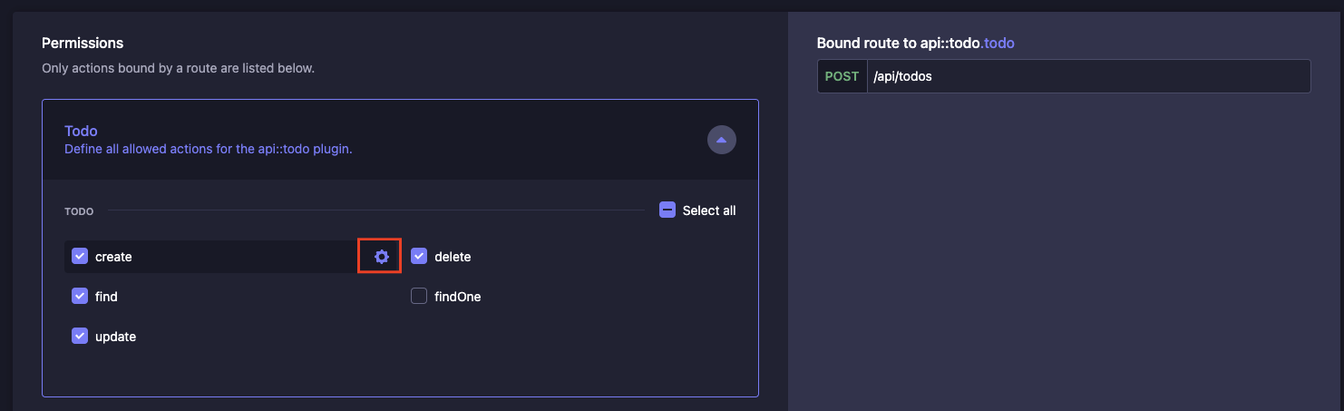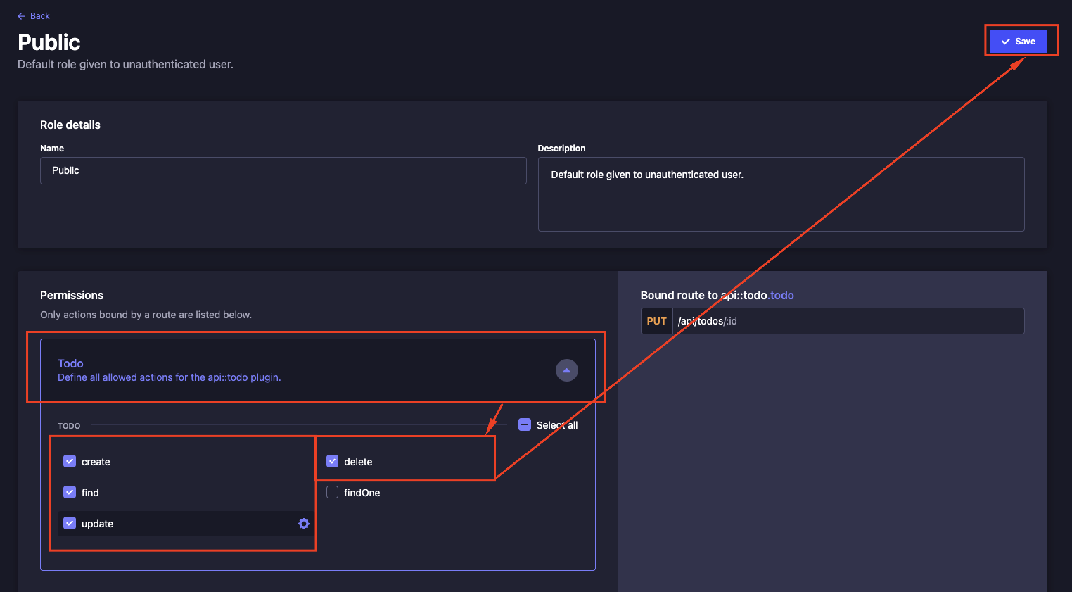 그런 다음 todos 드롭박스를 열고 create, delete, update 체크박스에 체크 한 후 Save 버튼을 클릭합니다.