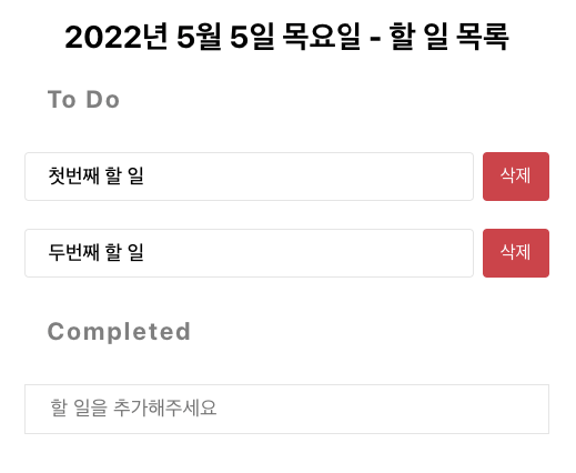 할 일을 보여주고 할 일을 완료 및 할 일로 변경하는 컴포넌트입니다. 추가로 삭제하는 기능도 포합합니다.