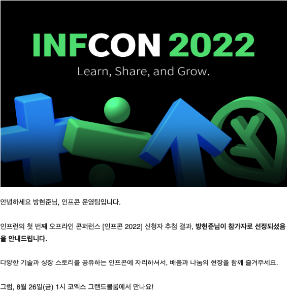 오랜만에 개발자 오프라인 컨퍼런스가 열렸습니다!!(그동안 컨퍼런스는 모두 온라인이었는데... 감동) 인프런에서 개최한 인프콘이란 행사였는데 오랜만에 열린 오프라인 컨퍼런스라 그런지 많은 개발자 분들이 신청을 하셨다고 들었습니다. 인프런에서도 이러한 상황에 몰릴걸 예상했는지 인원을 추첨으로 뽑았고 일단 저도 지원을 했는데 감사하게도 당첨이 되었습니다(짝짝짝)