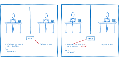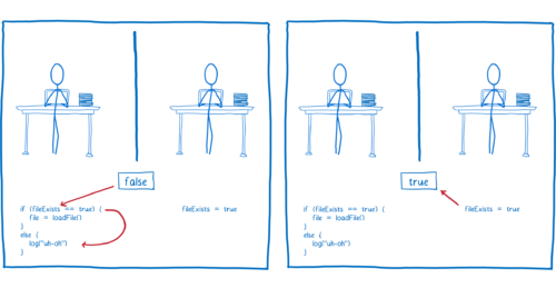 일단, 레이스 컨디션이 뭔지 부터 알아봅시다. 레이스 컨디션 이란 두 개 이상의 스레드가 공유 메모리의 특정 자원을 병행적으로(concurrently) 읽거나 쓸 때, 공용 데이터에 대한 접근이 어떤 순서에 따라 이루어졌는지에 따라 그 실행 결과가 달라지는 상황을 말합니다. 에를 들어볼까요? 아래 그림을 보면 총 2개의 스레드가 열심히 일을 하고 있습니다. 중간에서 파일이 존재하는 지 체크하는 플래그를 공유 메모리로 가지고 있습니다.