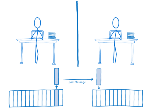 이러한 단점은 꽤 크게 다가오는데 만약 우리가 다른 스레드와 어떤 데이터를 공유하고 싶다면, 그 데이터를 복사해서 전달해야만 한다는 뜻입니다. 이 작업은 postMessage 함수에 의해 처리됩니다. postMessage 에 어떤 객체를 전달하면, postMessage 함수는 그것을 직렬화해서(serialize) 다른 web worker 에 전달합니다. 그러면 데이터를 전달 받은 web worker 가 데이터를 풀어서(deserialize) 메모리에 복사합니다. 하지만 이러한 방법은 매우 느린 작업입니다.