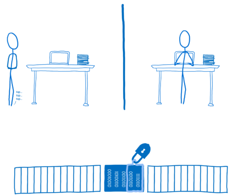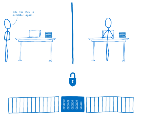 만약 두번째 쓰레드가 메모리를 사용하고 있을 때 첫번째 스레드가 두번째 스레드가 사용중인 메모리가 필요 할 때 첫번째 스레드는 메모리의 Lock이 걸려있는지 확인하고 Lock이 걸려 있으면 Lock이 풀릴때 까지 기다립니다.