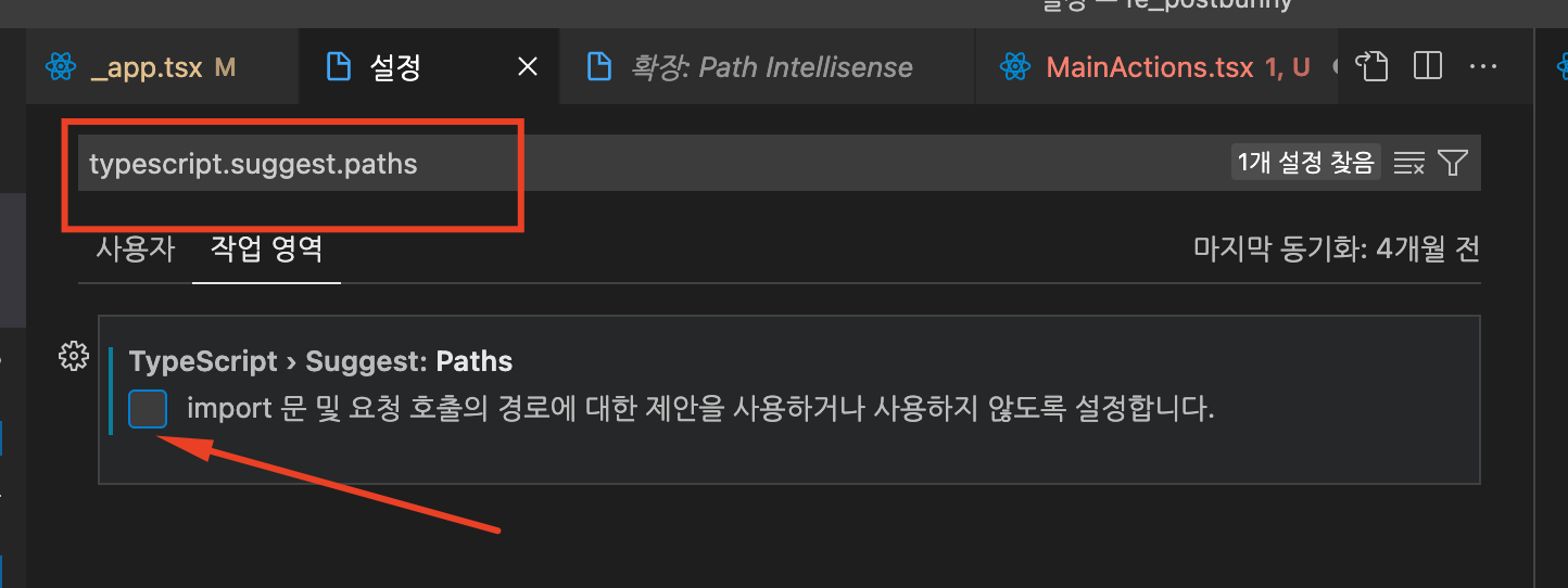 검색창에 typescript.suggest.paths를 입력해 주고 VSCode 자체 경로 제안을 해제해 준다.