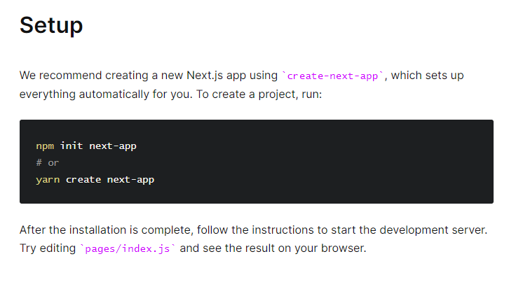Next.JS는 CREATE-REACT-APP처럼 CREATE-NEXT-APP이라는 좋은 기능을 제공합니다. 또한 NEXT.JS 공식 홈페이지에서는 특별한 이유가 있지 않는 이상 CREATE-NEXT-APP을 추천한다고 적혀 있습니다.