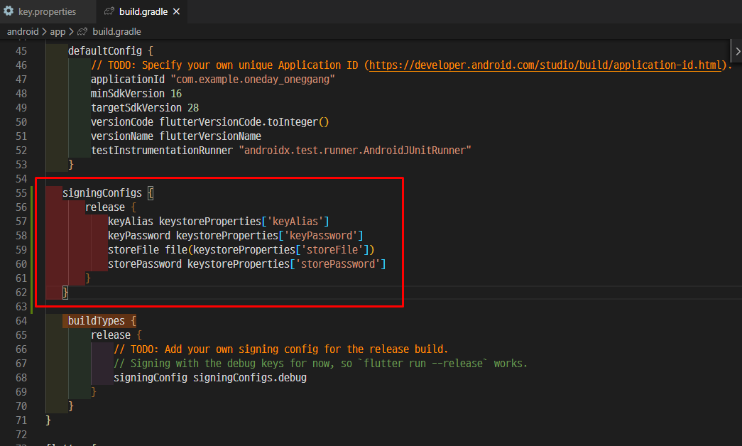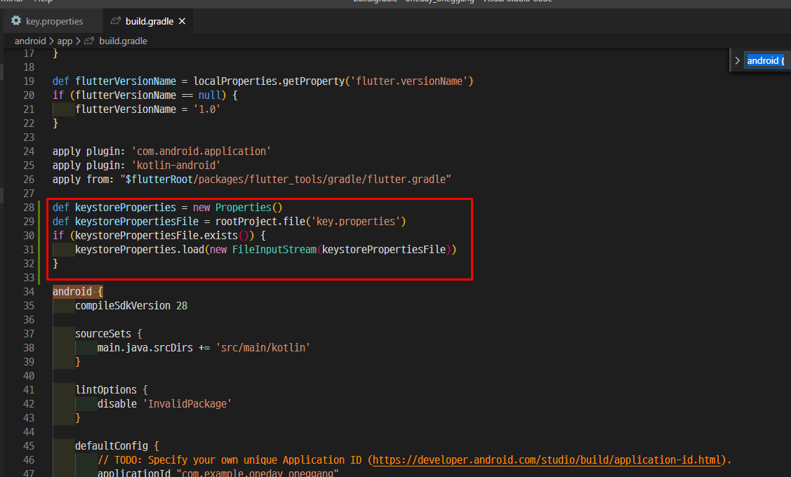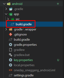Android에 Gradle에서도 해당 key.properties 파일에 접근할 수 있도록 설정해 줍니다.