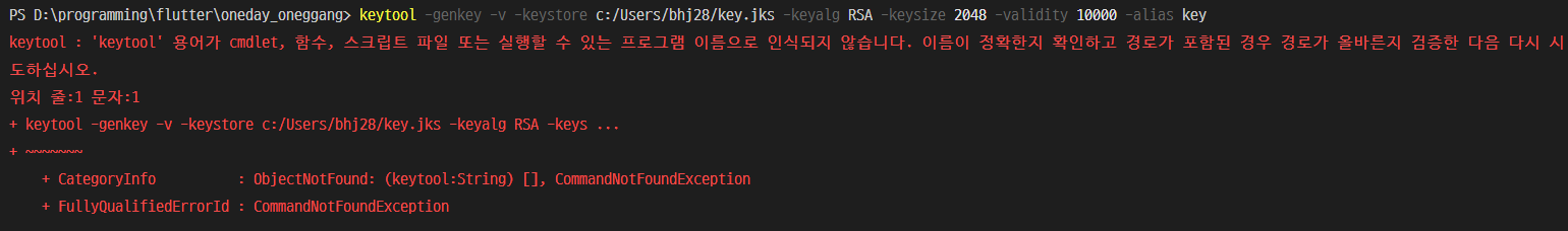 keytool : 'keytool' 용어가 cmdlet, 함수, 스크립트 파일 또는 실행할 수 있는 프로그램 이름으로 인식되지 않습니다. 이름이 정확한지 확인하고 경로가 포함된 경우 경로가 올바른지 검증한 다음 다시 시 도하십시오.