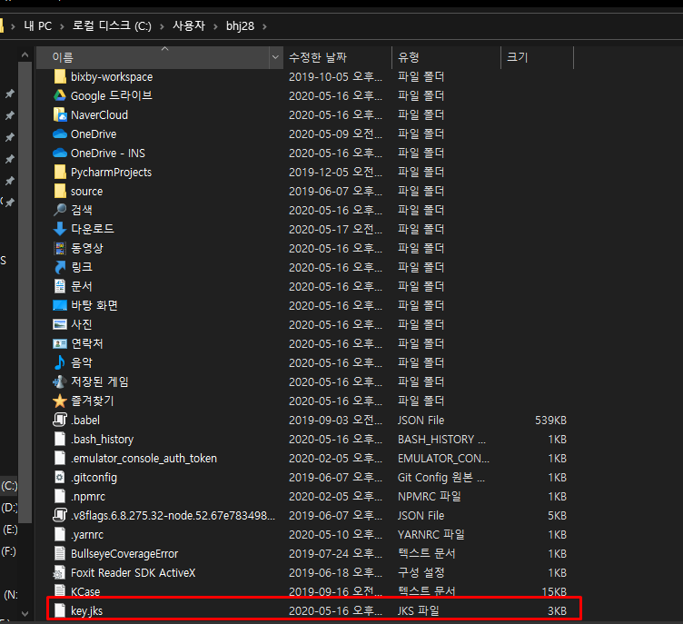 그럼 key.jks라는 파일이 C:\Users\USER_NAME 디렉토리에 존재하는 것을 확인할 수 있습니다.