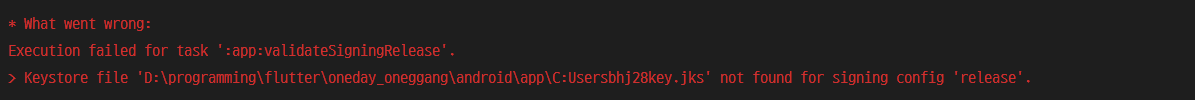 > Keystore file 'D:\programming\flutter\oneday_oneggang\android\app\C:Usersbhj28key.jks' not found for signing config 'release'.