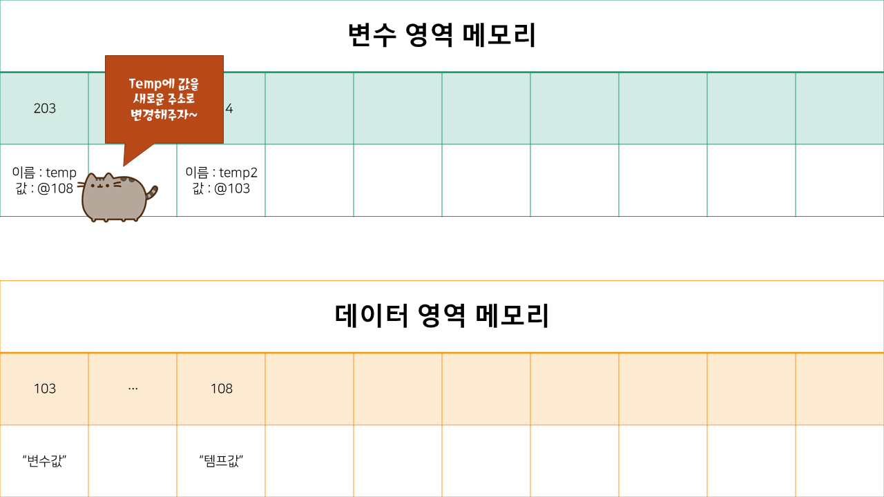 그리고 temp에 저장되어 있는 주소 값을 새로운 주소 값으로 변경해 줍니다.