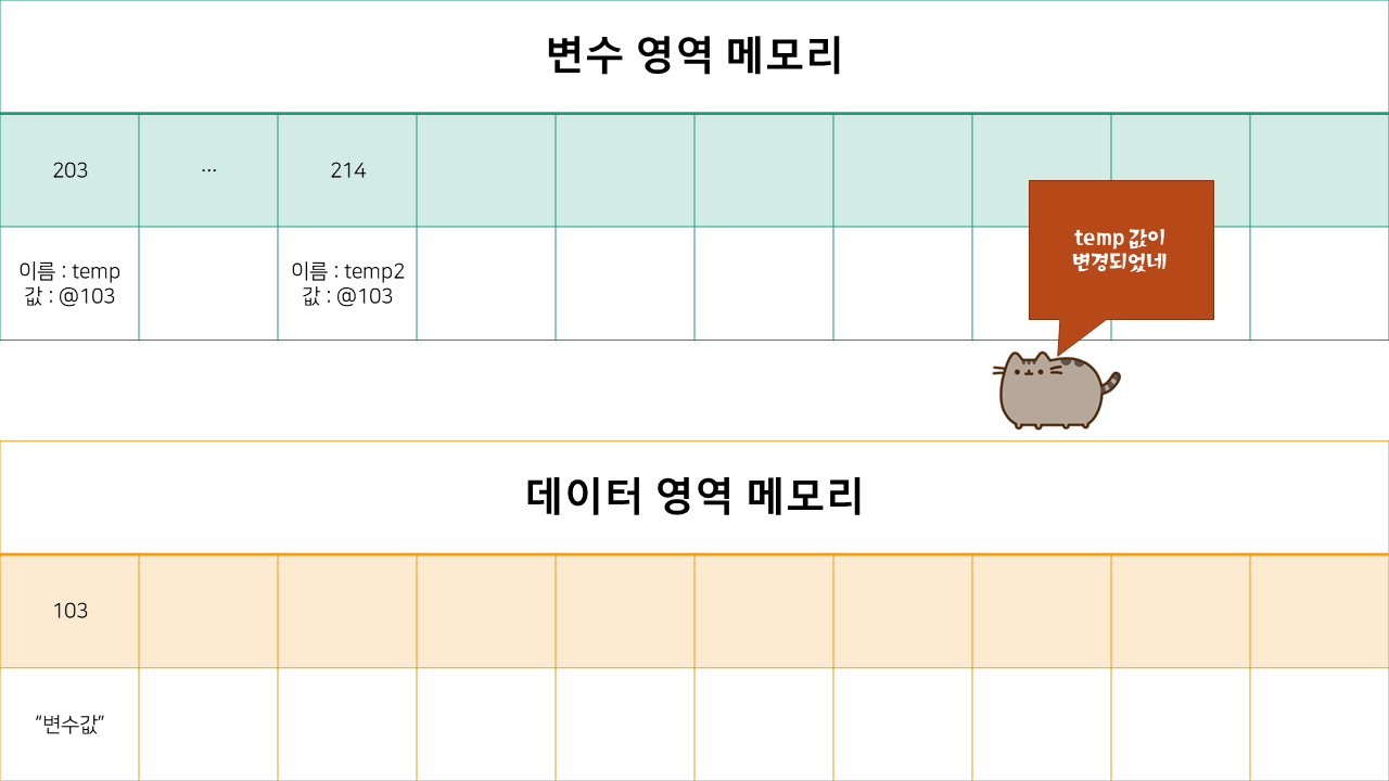자 이렇게 해서 temp와 temp2 가 가지는 값이 달라지게 됩니다.