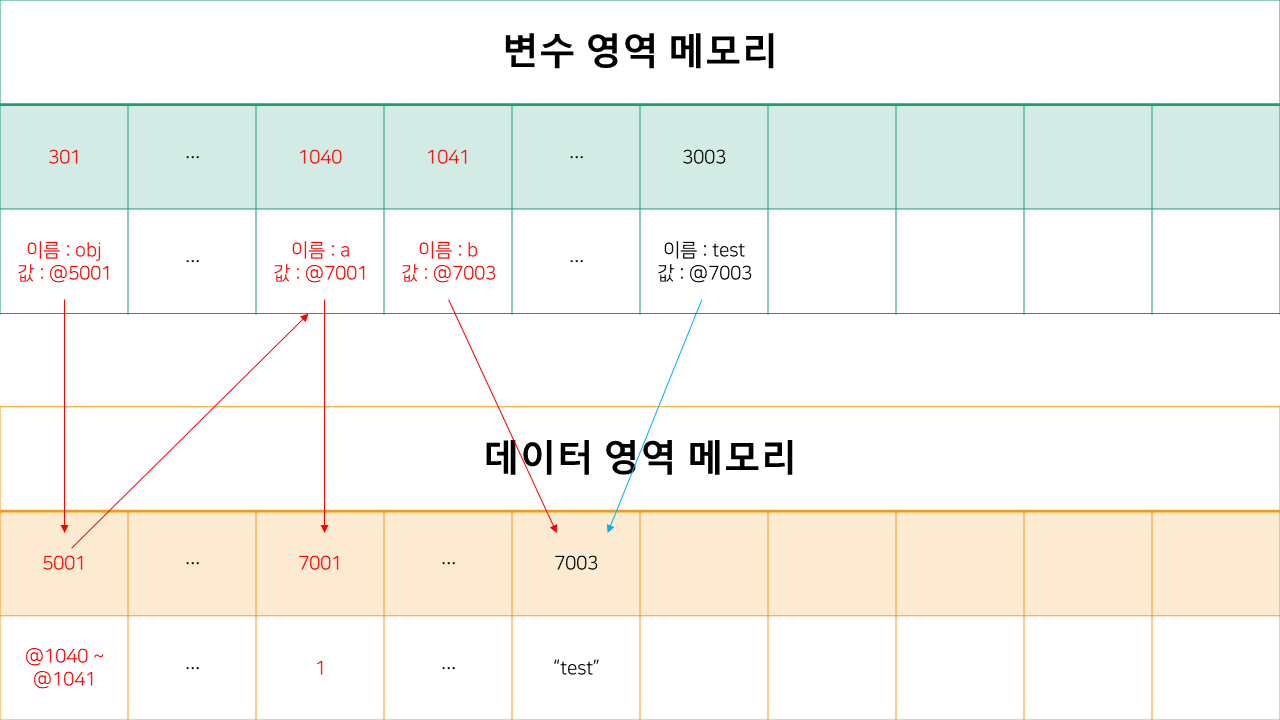 자바스크립트는 obj 객체를 301 메모리에 값으로 5001 메모리 주소를 저장합니다.