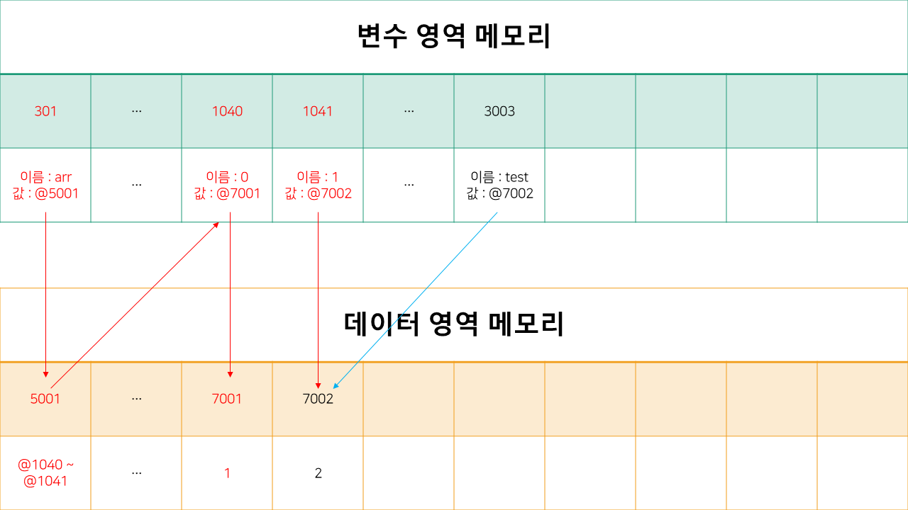 메모리에 301주소에 arr 메모리를 할당하고, 5001 주소를 할당합니다.